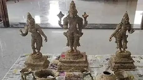 அங்கு சிலைகளை ஆய்வு செய்த போது அவை ஐம்பொன்னாலான பெருமாள், ஸ்ரீதேவி, மூ(மூத்த)தேவி சிலை என்பது தெரிய வந்தது. அதனுடன், மீட்கப்பட்ட பொருட்கள் சாமிக்கு பூஜைகள் செய்ய பயன்படுத்தப்படும் செப்பு பொருட்கள் என்பதும் தெரியவந்தது.