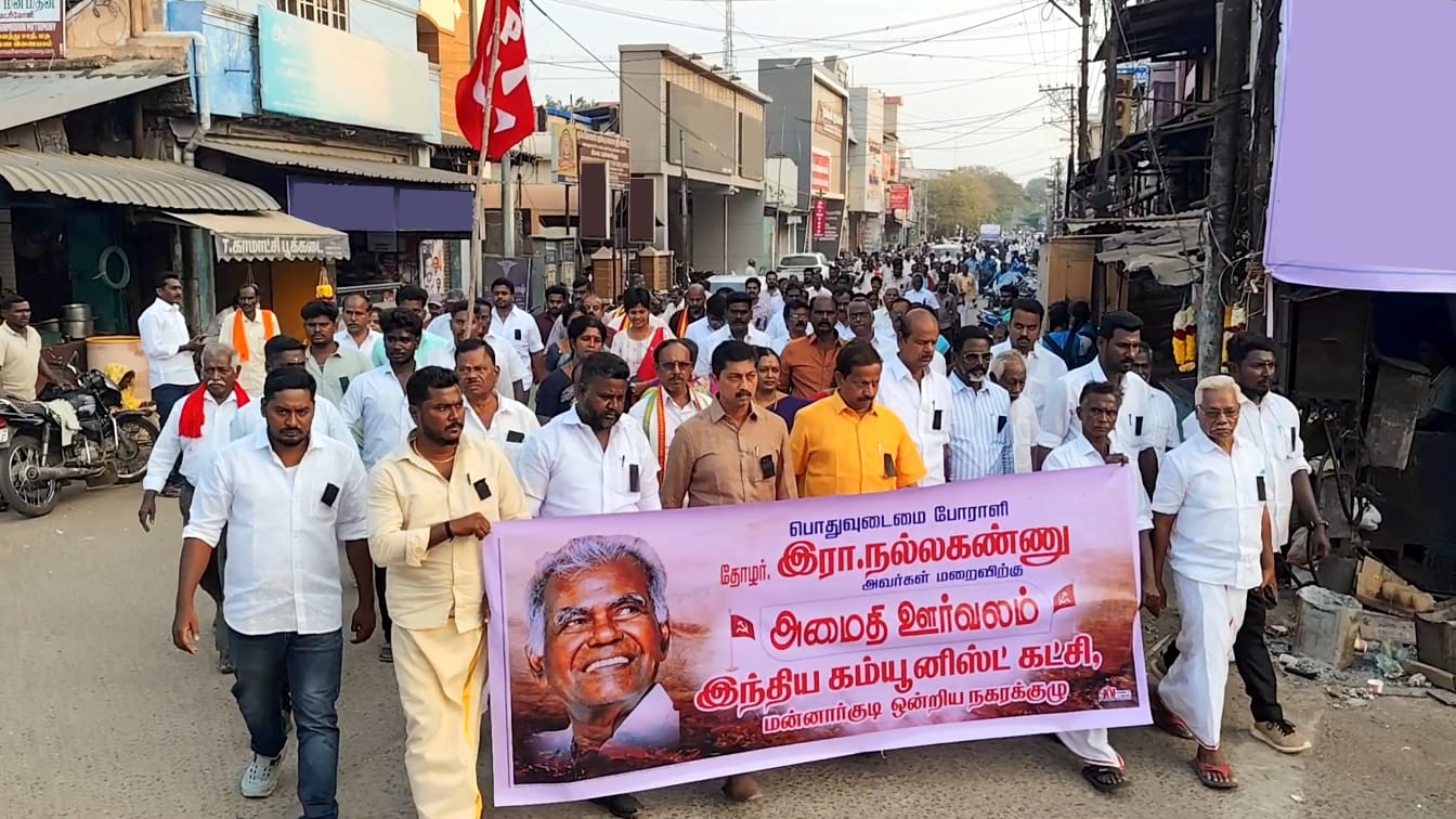 இந்திய கம்யூனிஸ்ட் கட்சியின் தகைசசால் விருது மூத்த தலைவர் தோழர் ஆர் நல்லகண்ணு உடல் நலக்குறைவால் உயர்ந்துள்ளார் அவருக்கு நினைவு அஞ்சலி செலுத்து வகையில் தமிழக முழுவதும் அனைத்து அரசியல் கட்சி சார்பில் அமைதி ஊர்வலம் அவரது திருவுருவப்படத்திற்கு மலர் தூவி அஞ்சலி செலுத்தி வருகின்றனர்.
