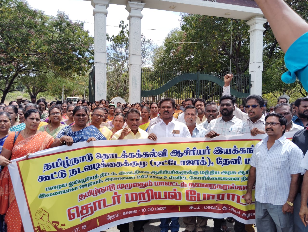 இதில் தேனி மாவட்டத்தில் பத்து அம்ச கோரிக்கைகளை வலியுறுத்தி சுமார் 300-க்கும் மேற்பட்ட ஆசிரியர் ஆசிரியைகள் கலந்து கொண்டு கோஷங்களை எழுப்பினர் கோரிக்கைகளாவது இடைநிலை ஆசிரியர்களுக்கு கடந்த இரண்டு ஆண்டுஊதிய குழுக்களில் இழைக்கப்பட்ட அநீதி கலையப்பட வேண்டும்