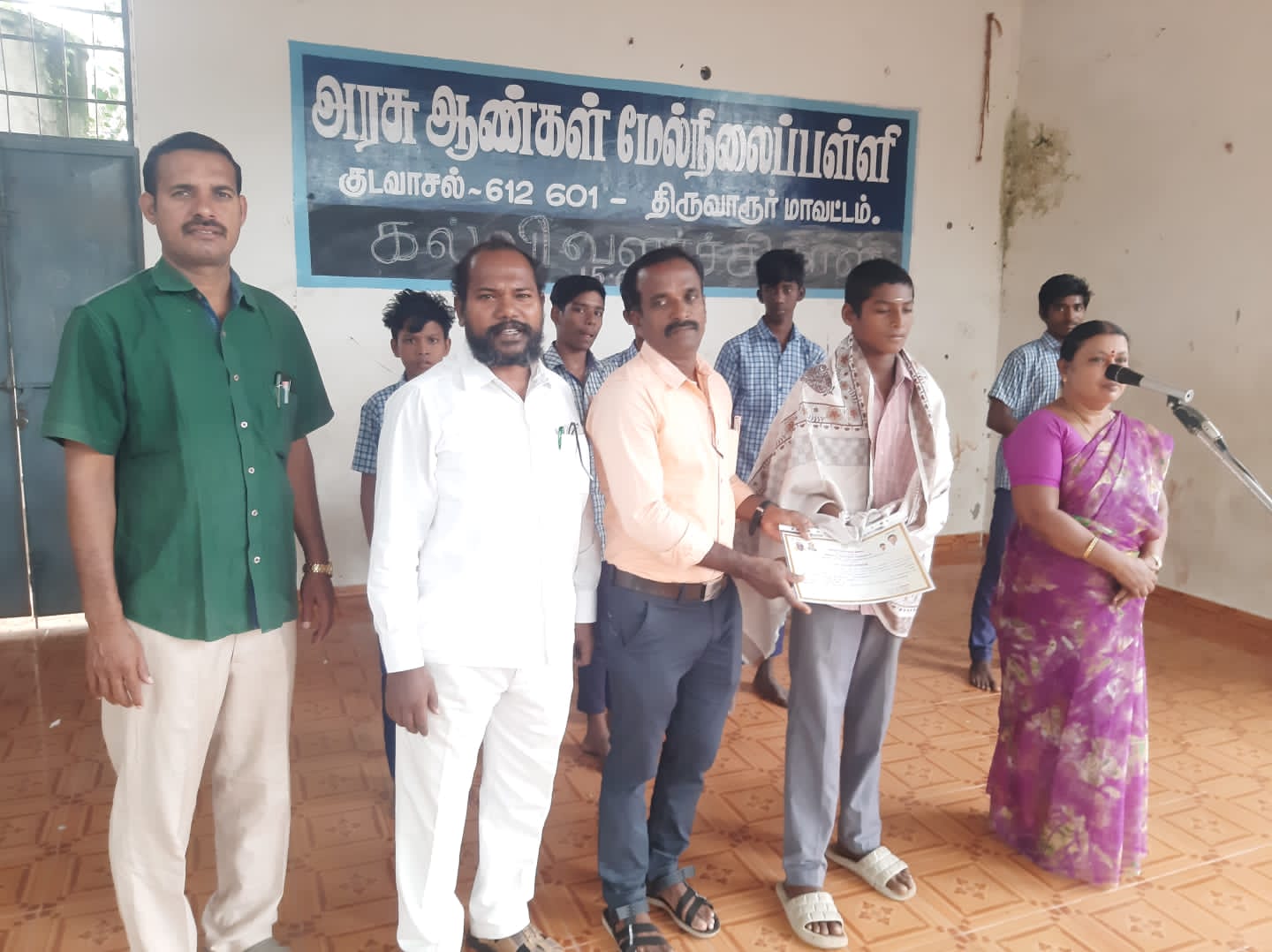 இந்நிலையில் பள்ளிக்கு பெருமை சேர்த்த ஆகாஷை பள்ளி தலைமை ஆசிரியர் ஜெயவேல் சால்வை அணிவித்து பாராட்டினார், உடன் உதவி தலைமை ஆசிரியர் சிவக்குமார் பேச்சு போட்டிக்கு பயிற்சி அளித்த ஆசிரியர் செல்வக்குமார், இருதயராஜ், வழிகாட்டி ஆசிரியர் சுரேஷ் ஆகியோர்களை பள்ளியின் சார்பாக பாராட்டுகளும், நன்றியும் தெரிவித்துக் கொள்ளப்பட்டது.