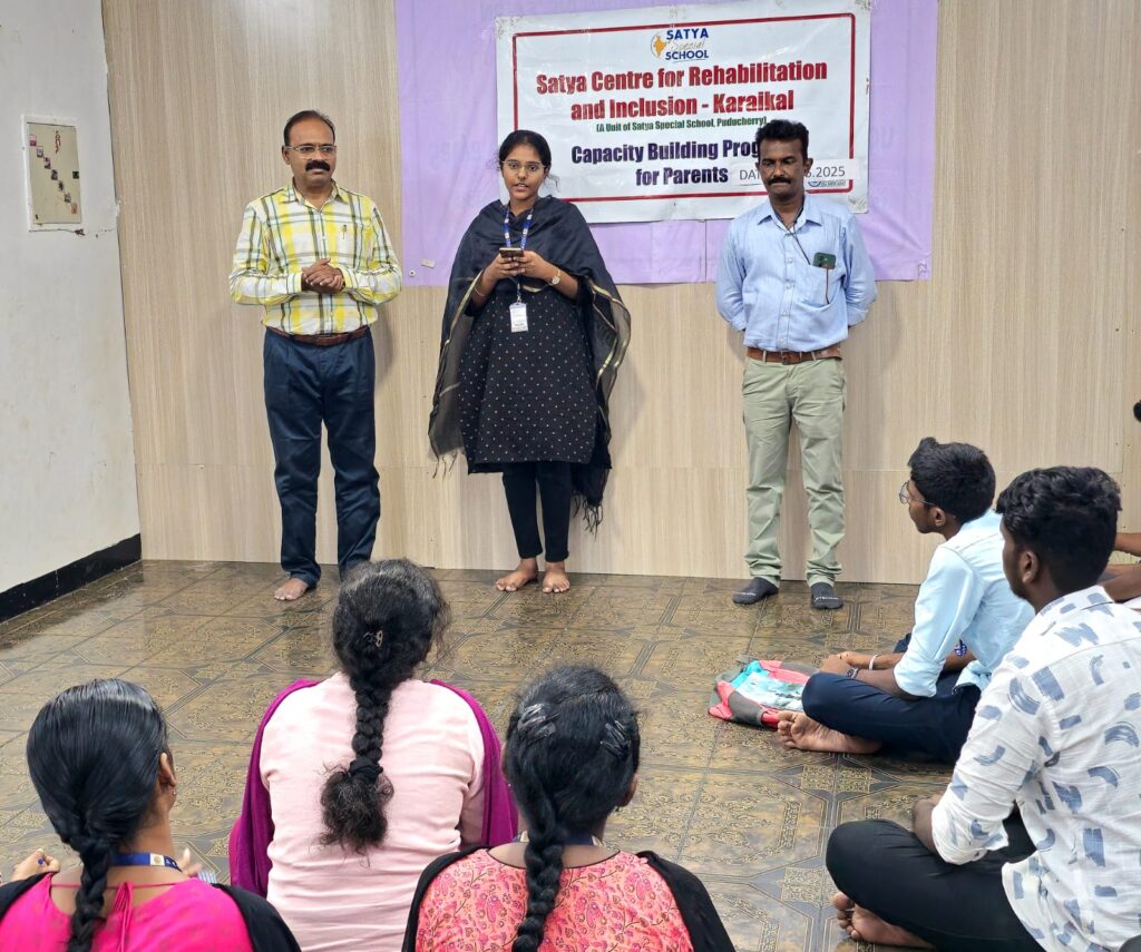 அதன் ஒரு அங்கமாக, நாடு வளர்ச்சியை வேகமாக அடைய அரசு துறைகள் மட்டுமன்றி, அரசு சாரா தன்னார்வ தொண்டு நிறுவனங்களின் பங்களிப்பும் அவசியம் என்பதால், காரைக்கால் காமராஜர் சாலை அருகே, இலக்கம் 73, மெயின் ரோடு, ராஜாதி நகரில் மாற்றுத் திறனாளி குழந்தைகளின் நலனுக்காக முன்மாதிரியாக செயல்படும் சத்யா சிறப்பு பள்ளியில், வேளாண் கல்லூரி மாணவ, மாணவியருக்கு இரு நாள் பயிற்சி வழங்கப்பட்டது.