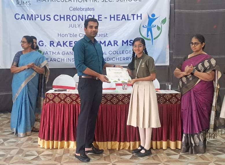 மேலும் இந்த நிகழ்ச்சியில் மாணவ மாணவிகளுக்கு இது சம்பந்தப்பட்ட போட்டிகள் நடத்தப்பட்டு இந்த போட்டியில் வெற்றி பெற்ற மாணவ மாணவிகளுக்கு சிறப்பு விருந்தினாராக பங்கேற்ற பாண்டிச்சேரி மஹாத்மா காந்தி மெடிக்கல் ரிசெர்ச் இன்ஸ்டிடியூட் டாக்டர் ஜி ராகேஷ் குமார் மாணவர்களுக்கு பரிசினை வழங்கி மனதார வாழ்த்தினார்