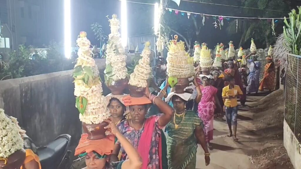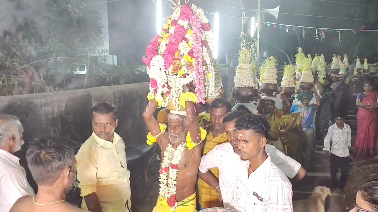 தொடர்ந்து செவ்வாய் இரவு திருமுல்லைவாசல் கடற்கரையில் இருந்து சக்தி கரகம் எடுத்துவரப்பட்டது. அதனையடுத்து வீடுகளில் வளர்க்கப்பட்ட முளைப்பாரிக்கு சிறப்பு படையலிட்டு பக்தர்கள் மேளதாள மங்கள வாத்தியங்கள் முழங்க கோலாட்டத்துடன், சக்தி கரகம் முன் செல்ல, முலைப்பாரிகளை தலையில் சுமந்து ஏராளமான பக்தர்கள் ஊர்வலமாக கோயிலுக்கு எடுத்து வந்தனர். பின்னர் பெண்கள், ஆண்கள் ஒன்றாக இணைந்து கும்மியடித்து குலவை இட்டு வழிபாடு செய்தனர்.
