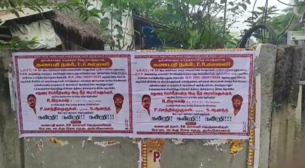 தெருவாசிகள் சார்பாக நன்றி தெரிவித்து அனைத்து பகுதிகளிலும் சுவரொட்டி ஒட்டி வருகின்றனர். இந்த சுவரொட்டிகளால் கும்பகோணம் பரபரப்பு ஏற்பட்டுள்ளது.