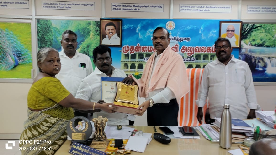 புதுக்கோட்டை மாவட்டம் கந்தர்வகோட்டை ஒன்றியம் ஊராட்சி ஒன்றிய நடுநிலைப்பள்ளி அக்கச்சிப்பட்டி நடுநிலைப்பள்ளிக்கு பள்ளிக் கல்வித் துறையின் சார்பில் பேராசிரியர் அன்பழகன் விருது பெற்றதற்கு புதுக்கோட்டை மாவட்ட முதன்மை கல்வி அலுவலர் கூ.சண்முகம் அவர்களிடம் அக்கச்சிப்பட்டி ஊராட்சி ஒன்றிய நடுநிலைப்பள்ளி தலைமை ஆசிரியர் தமிழ்செல்வி நேரில் சந்தித்து வாழ்த்து பெற்றார்.
