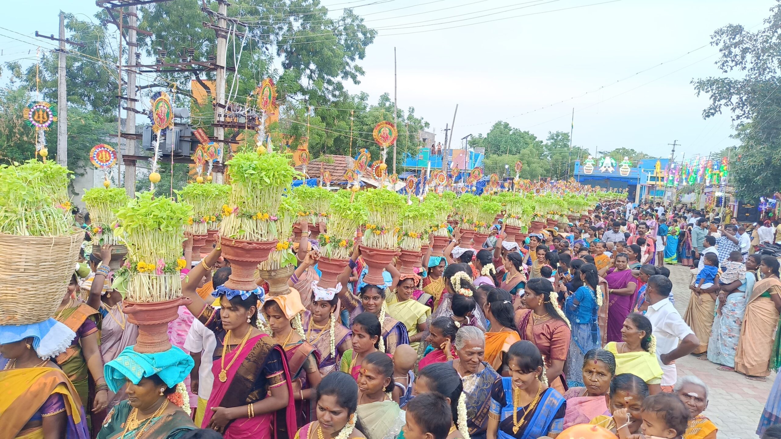 முன்னதாக கோவில் முன்பு முளைப்பாரியை வைத்து பெண்கள் கும்மியடித்தனர். பின்னர் 500 க்கும் மேற்பட்ட பெண்கள் முளைப்பாரியை தலையில் சுமந்து இரண்டு வரிசையாக சென்றனர். இந்த ஊர்வலம் மேளதாளம், வான வேடிக்கையுடன் கிராமத்தின் முக்கிய வீதிகள் வழியாக சென்று இறுதியில் அப்பகுதியில் உள்ள ஆற்றில் முளைப்பாரியை கரைத்தனர்.