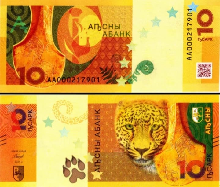 பணத்தாளின் பின்பக்கம் அப்காஸ் எழுத்து , அப்சார் சின்னம், விலங்கின் பழமையான வரைபடத்துடன் கூடிய பண்டைய வெண்கல கோடரி, அலபாஷாவின் பகட்டான மேல் பகுதி ஏழு ஐந்து முனை நட்சத்திரங்கள் உள்ளன.QR குறியீடு பணத்தாளில் இணைக்கப்பட்டுள்ளன.