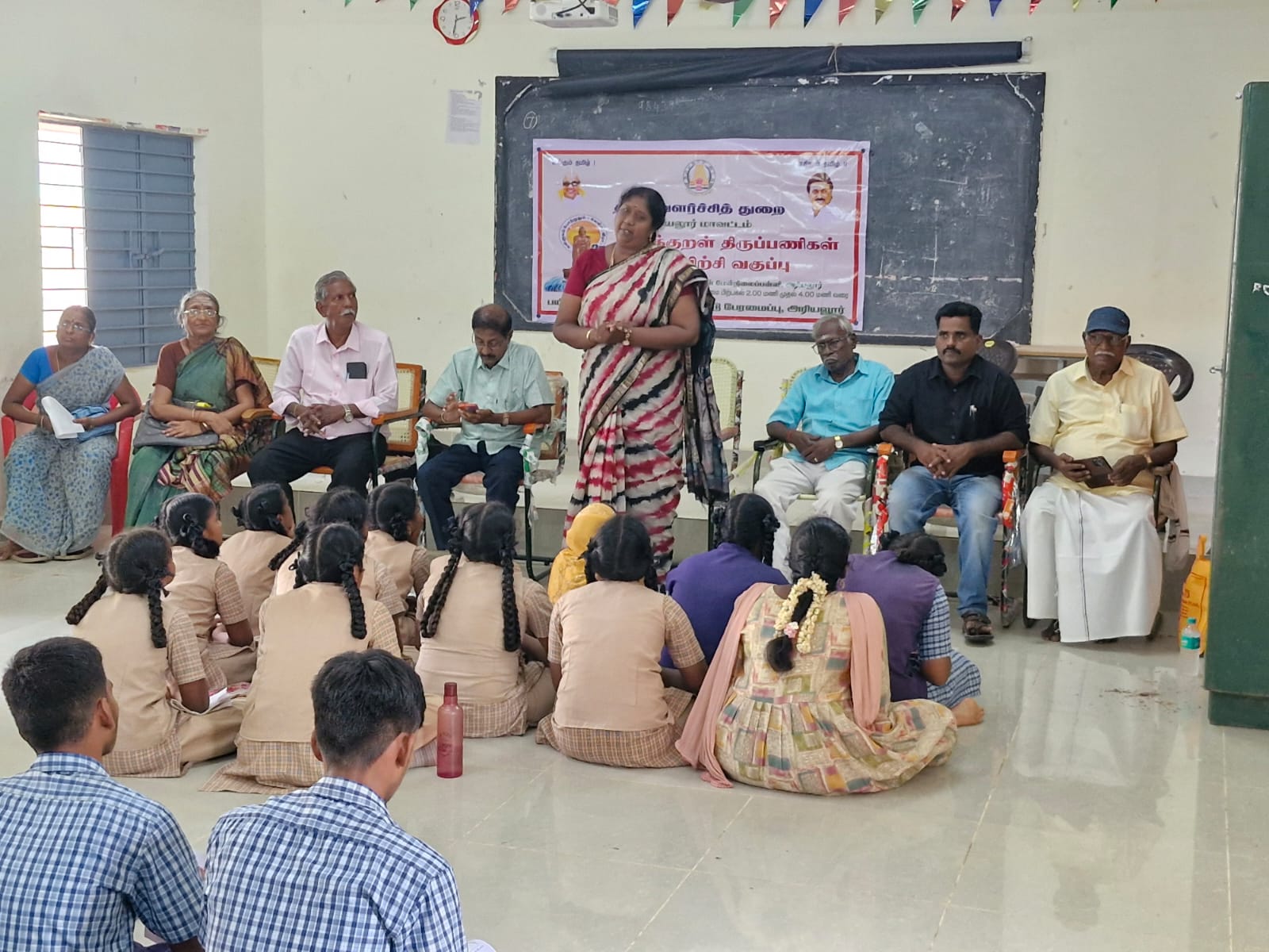 இதனை தொடர்ந்து நடைபெற்ற நிகழ்ச்சிக்கு பள்ளியின் தலைமை ஆசிரியை மு கவிதா தலைமை தாங்கினார் பள்ளியின் முதுகலை தமிழ் ஆசிரியர் ராமகிருஷ்ணன் அனைவரையும் வரவேற்று பேசினார்