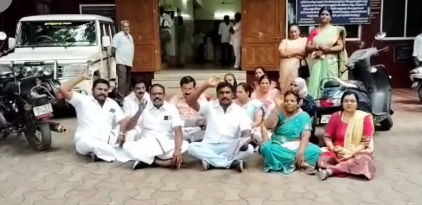 அண்ணா திமுக கவுன்சிலர்கள் 6 பேர்களும் அஜெண்டா வில் 2 ஆவது தீர்மானத்தை தவிர பிற தீர்மானங்களை நிறைவேற்ற ஆதரவு இல்லை என்று ஆணையரிடம் கடிதம் கொடுத்தனர் மீண்டும் நகராட்சி அலுவலகம் முன்பு தரையில் அமர்ந்து திமுக கவுன்சிலர்கள் தர்ணா செய்தனர். ஷாப்பிங் காம்ப்ளக்ஸ் கடைகளுக்கு டெபாசிட் தொகையை குறைக்கவில்லை என்றால் அனைவரும் ராஜினாமா செய்வோம் என்று அதிமுக கவுன்சிலர்கள் கூறினார்கள்