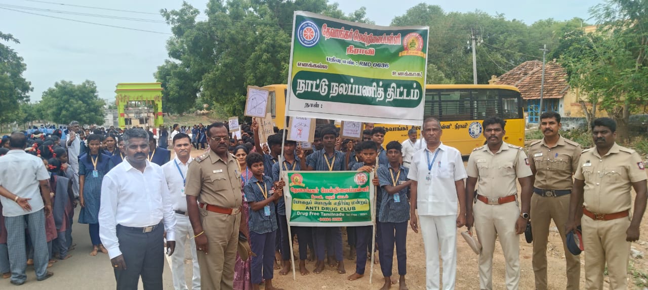 ராமநாதபுரம் மாவட்டம் கமுதி அடுத்துள்ள நீராவி தேவாங்கர் மேல்நிலைப்பள்ளி மாணவர்கள் சார்பில் போதைப்பொருள் தடுப்பு விழிப்புணர்வு பேரணி நடைபெற்றது. இந்த பேரணிக்கு பள்ளியின் செயலாளர் கே. எஸ்.ராமர் தலைமை தாங்கினார்.