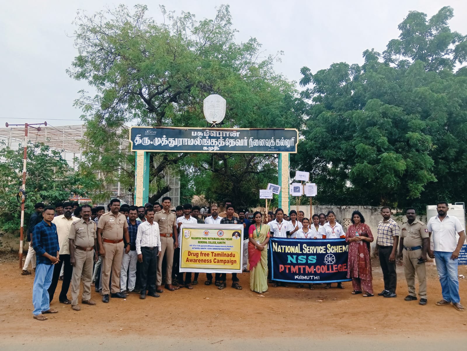 ராமநாதபுரம் மாவட்டம் கமுதி கோட்டைமேட்டில் உள்ள பசும்பொன் உ. முத்துராமலிங்கத் தேவர் நினைவுக் கல்லூரியில் போதையில்லா தமிழகம் என்ற தலைப்பில் விழிப்புணர்வு நிகழ்ச்சி நடைபெற்றது NSS PO முனைவர் R.மேரிசுஜின் வரவேற்புரையாற்றினார்.