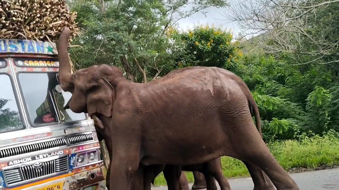 தாளவாடி அருகே லாரியை நிறுத்தி கரும்பை சுவைத்த காட்டு யானைகளின் வீடியோ தற்போது வைரலாகி வருகிறது.