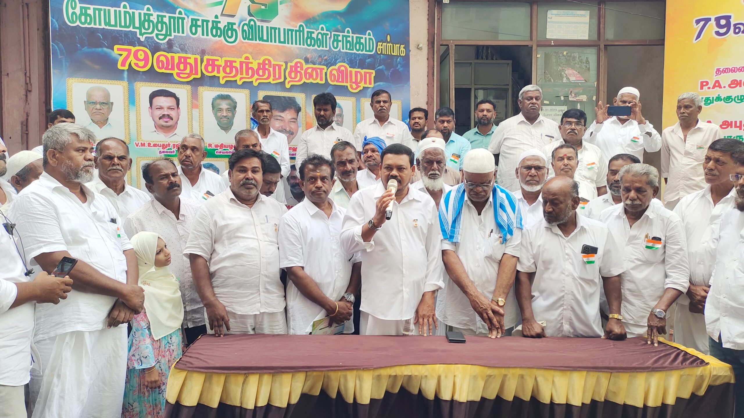 இந்நிலையில் கோயம்புத்தூர் சாக்கு வியாபாரிகள் சங்கம் சார்பாக 79 வது சுதந்திர தின விழா சங்கத்தின் பொதுக்குழு தலைவர் பி ஏ ஹனிபா தலைமையில் நடைபெற்றது இதில் சங்கத்தின் தலைவர் உபைதுர் ரஹ்மான் தேசிய கொடி ஏற்றி மரியாதை செய்தார்.