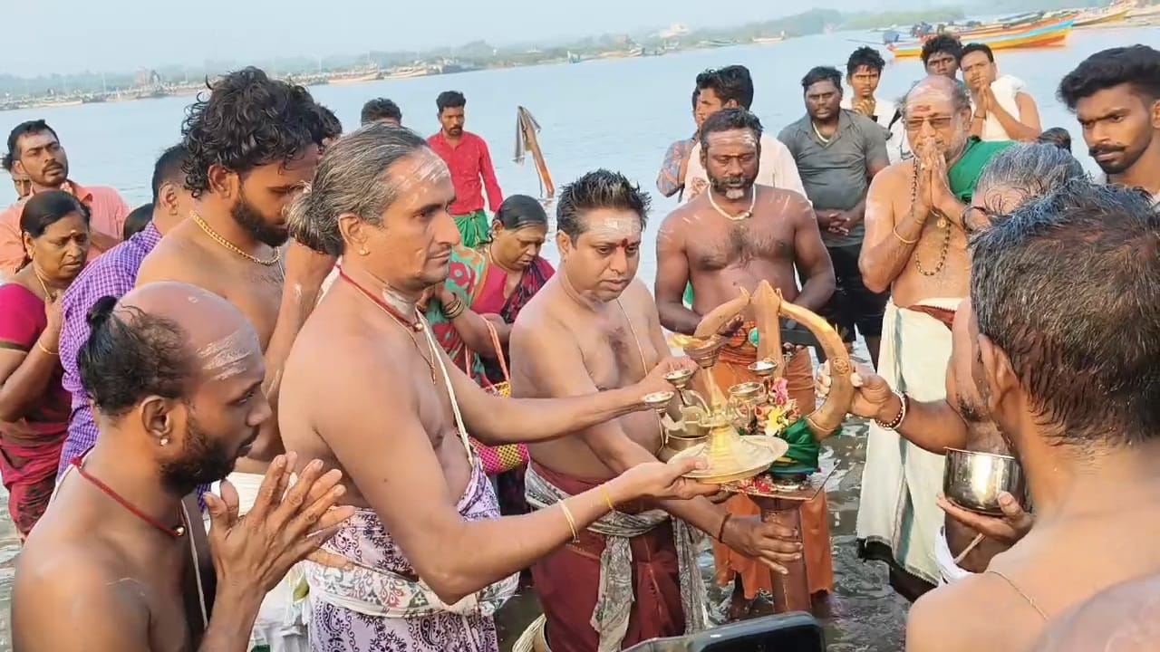 அங்கு சிவாச்சாரியார்கள் சுவாமி, அம்பாளுக்கு விசேஷ பூஜைகளை நடத்தி வைத்தனர். அஸ்திரதேவருக்கு பல வகையான அபிஷேகங்கள் நடைபெற்றது. பின்னர் அஸ்திர தேவர் காவிரி சங்கமத் துறையில் தீர்த்தம் அளிக்கும் தீர்த்தவாரி நிகழ்ச்சி நடைபெற்றது. திரளான பக்தர்கள் காவிரி கடலுடன் சங்கமிக்கும் இடத்தில் நீராடி சுவாமி அம்பாளை தரிசனம் செய்தனர்.