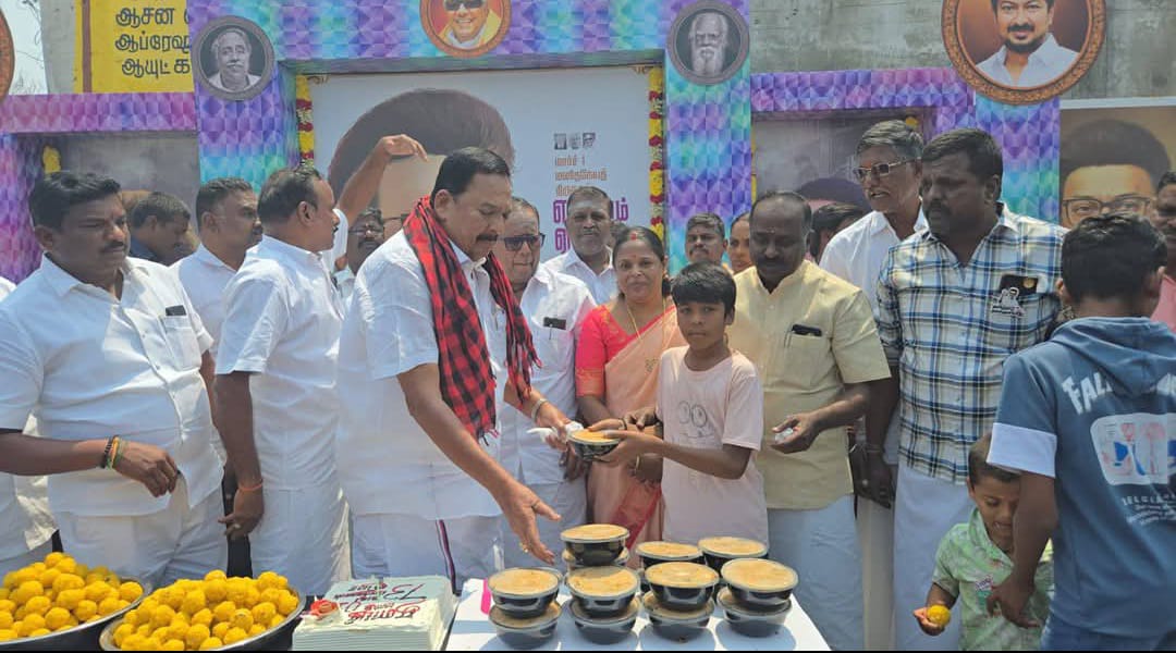 இந்த நிகழ்வுக்கு சிறப்பு அழைப்பாளராக அமைச்சர்கள் காந்தி நினைவில் பங்கேற்று கேக் வெட்டி இனிப்பு மற்றும் இளைஞர்களுக்கு விளையாட்டு உபகரணங்கள் முதியோர்களுக்கு வேட்டி சேலை பிரியாணி வழங்கினார்.