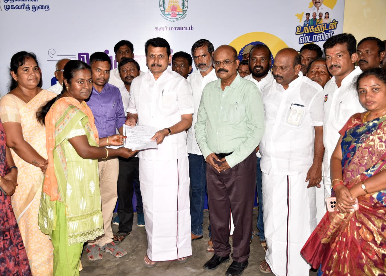 கரூர் சட்டமன்ற உறுப்பினர் வி.செந்தில்பாலாஜி கரூர் மாநகராட்சி வார்டு எண் 8,9 மற்றும் மண்மங்கலம் வட்டம் ஆகிய பகுதிகளுக்கு நடைபெற்ற இத்திட்ட முகாமில் மாவட்ட ஆட்சியர் மீ.தங்கவேல் இ.ஆ.ப. தலைமையில் 26 பயனாளிகளுக்கு ரூ. 9.90 இலட்சம் மதிப்பீட்டில் நலத்திட்ட உதவிகளை வழங்கினார்.