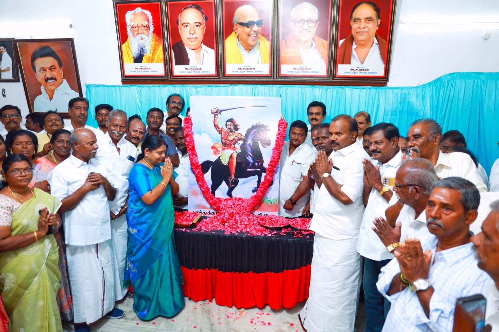 தூத்துக்குடி சுதந்திர போராட்ட வீரர் ஓண்டிவீரன் 254வது நினைவு நாளையொட்டி வடக்கு மாவட்ட திமுக சார்பில் எட்டையாபுரம் ரோட்டிலுள்ள கலைஞர் அரங்கில் அலங்கரிக்கப்பட்ட ஓண்டிவீரன் படத்திற்கு மாலை அணிவிக்கும் நிகழ்ச்சிக்கு மாநகர திமுக செயலாளர் ஆனந்தசேகரன் முன்னிலையில் வடக்கு மாவட்ட திமுக செயலாளரும் சமூகநலன் மற்றும் மகளிர் உரிமைத்துறை அமைச்சருமான கீதாஜீவன், மேயர் ஜெகன் பொியசாமி ஆகியோர் மலர் அஞ்சலி செலுத்தி மரியாதை செய்தனர்.