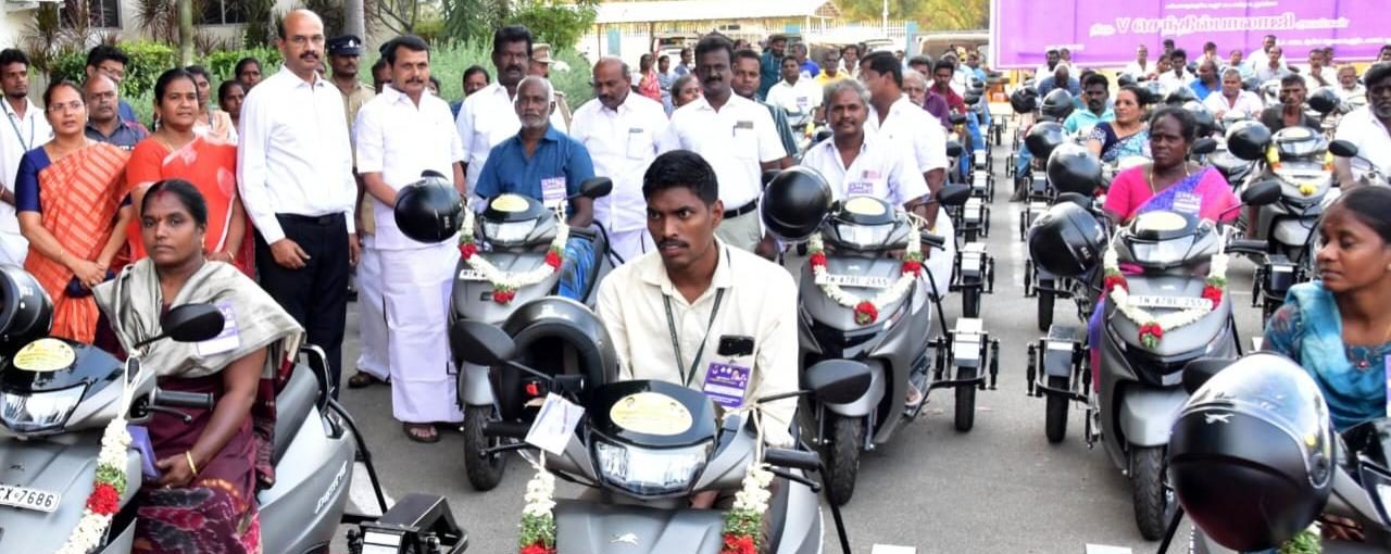 கரூர் மாநகராட்சிக்குட்பட்ட பகுதிகளில் ரூ.8.79 கோடி மதிப்பீட்டில் 1 புதிய வளர்ச்சித் திட்டப் பணிகளை தொடங்கி வைத்தும், 2 முடிவுற்ற திட்டப் பணிகளை திறந்து வைத்தார். கரூர் சட்டமன்ற உறுப்பினர் வி.செந்தில்பாலாஜி, மாவட்ட ஆட்சியர் கு.ரவிகுமார் தலைமையில், மாவட்ட ஆட்சியர் அலுவலக வளாகத்தில் நடைபெற்ற நிகழ்ச்சியில் மாற்றுத்திறனாளிகள் நலத்துறையின் சார்பாக 80 மாற்றுத்திறனாளிகளுக்கு ரூ.81.44 இலட்சம் மதிப்பீட்டில் இணைப்புச் சக்கரம் பொருத்தப்பட்ட பெட்ரோல் ஸ்கூட்டர்களை வழங்கி,கரூர் மாநகராட்சிக்குட்பட்ட பகுதிகளில் ரூ.8.79 கோடி மதிப்பீட்டில் 1 புதிய வளர்ச்சித் திட்டப் பணிகளை தொடங்கி வைத்து மற்றும் 2 முடிவுற்ற பணிகளை திறந்து வைத்தார்.