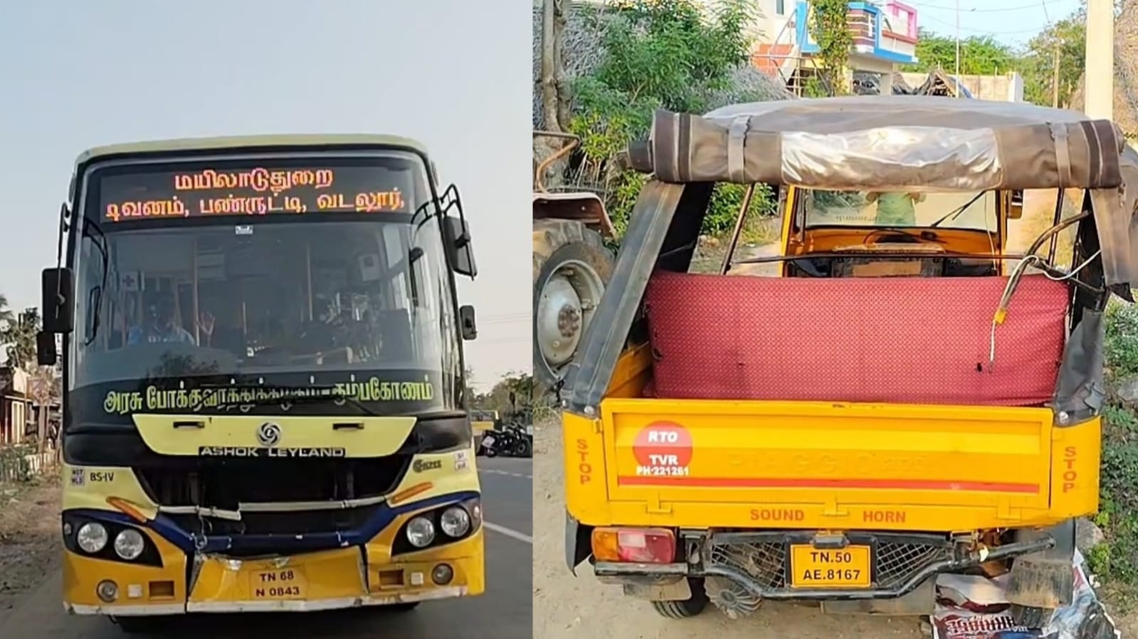 இன்று மாலை 5.30 மணி அளவில் திருவாரூரில் இருந்து மயிலாடுதுறை நோக்கி சென்ற அரசு பேருந்து வண்டாம்பாளை பகுதியில் சென்று கொண்டிருக்கும்போது, அரசு பேருந்துக்கு முன்னால் சென்ற ஆட்டோ திடீரென திரும்பியதால், பின்னால் வந்த அரசு பேருந்து ஆட்டோ மீது எதிர்பாராதவிதமாக மோதியது.