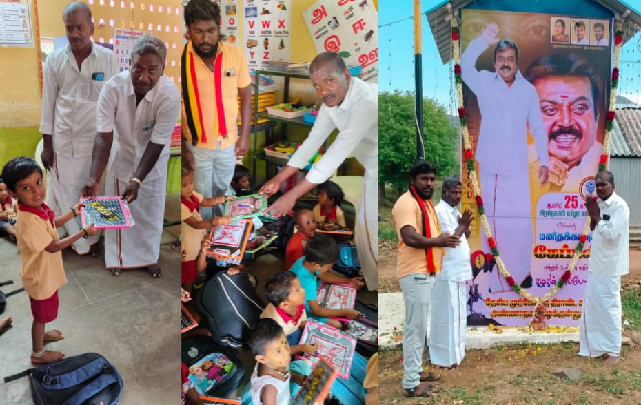 இதனைத் தொடர்ந்து துவக்க பள்ளி மற்றும் அங்கன்வாடி மாணவ மாணவிகளுக்கு நோட்டு, பென்சில், சிலேட்டு வழங்கப்பட்டது.விழாவில் தேமுதிக தலைவர் விஜயகாந்த் உதவியாளர் சிவக்குமார்,கிளைக் கழக நிர்வாகிகள் எம்ஆர்எப் வினோத்,புஷ்பராஜ், ஐடி வினோத்,உதயகுமார், சதீஷ்,குணால் ,கதிரேசன், விஜயகுமார் உள்ளிட்ட தேமுதிக நிர்வாகிகள் தொண்டர்கள் பொதுமக்கள் கலந்து கொண்டனர்.