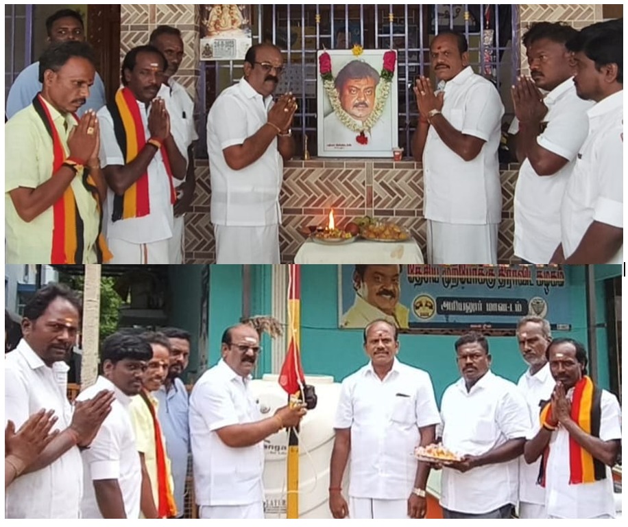 அரியலூர் மாவட்ட தேமுதிக சார்பில் அரியலூர் கட்சி அலுவலகத்தில் மாவட்ட கழக செயலாளர் இராமஜெயவேல் தலைமை தாங்கி விஜயகாந்த் படத்திற்கு மலர் தூவி மரியாதை செலுத்தினார்