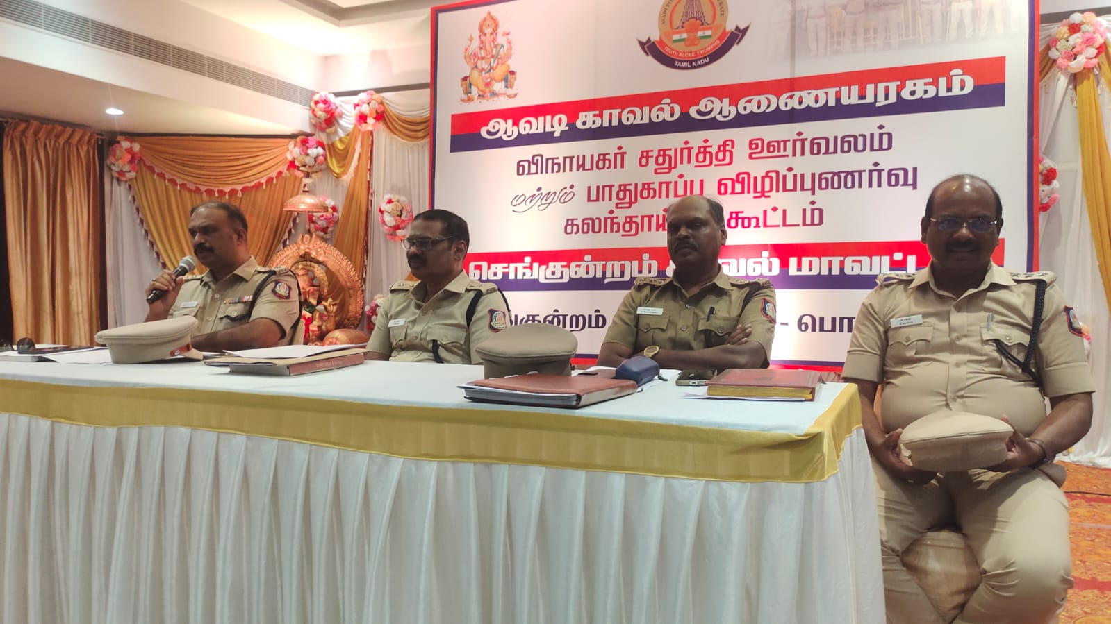 செங்குன்றம் காவல் மாவட்ட துணை ஆணையர் பாலாஜி தலைமையில் விநாயகர் சதுர்த்தி ஊர்வலம் மற்றும் பாதுகாப்பு விழிப்பு உணர்வு குறித்து கலந்தாய்வுக் கூட்டம் செங்குன்றம் பைபாஸ் சாலையில் உள்ள தனியார் திருமண மண்டபத்தில் நடைபெற்றது.