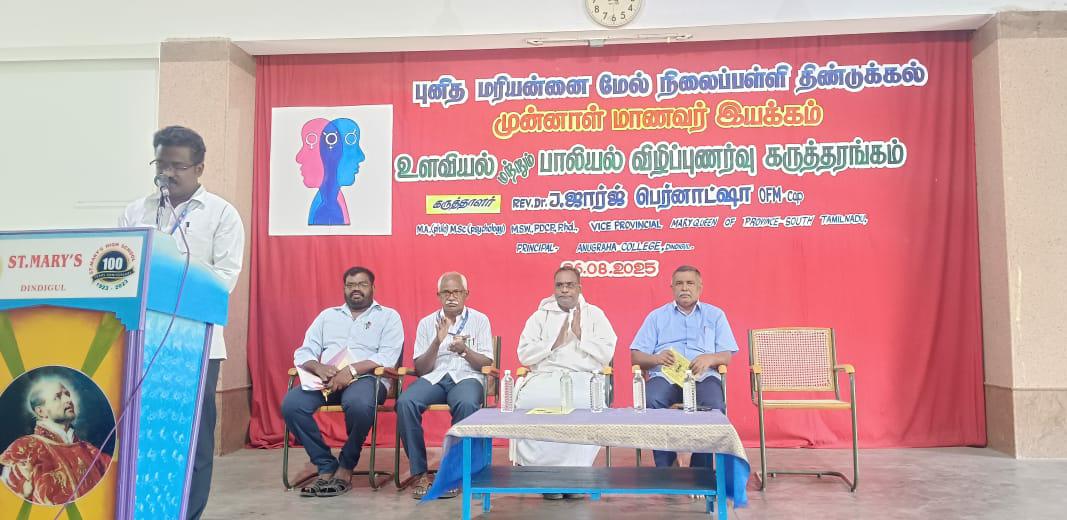 திண்டுக்கல் நகர் புனித மரியன்னை மேனிலைப் பள்ளியில் முன்னாள் மாணவர் இயக்கம் (கல்வி& சமூகப் பணிகள் 1950-2025) சார்பாக 11ஆம் வகுப்பு மாணவர்களுக்கான உளவியல் பாலியல் விழிப்புணர்வு கருத்தரங்கம் பள்ளியின் பவள விழா அரங்கில் நடைபெற்றது.
