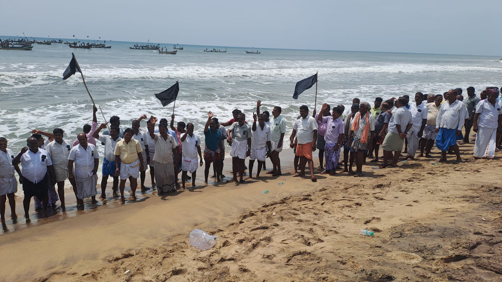 சீர்காழி தாலுக்கா தலைமை கிராமமாக உள்ள வானகிரி கிராமத்தில் 500-க்கும் மேற்பட்ட மீனவர்கள், பைபர் படகுகளில் கருப்புக் கொடி கட்டி கடலில் நிறுத்தியும், கையில் கருப்பு குடி ஏந்தி கடலில் இறங்கி ஆர்ப்பாட்டத்தில் ஈடுபட்டு வருகின்றனர்.