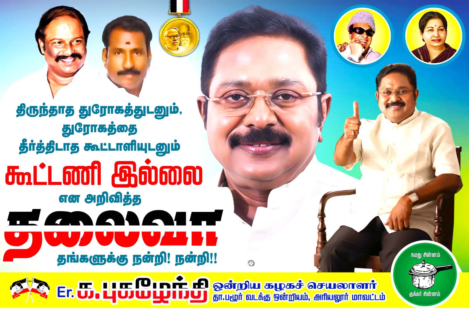 அம்மா மக்கள் முன்னேற்ற கழகம் தேசிய ஜனநாயக கூட்டணியில் இருந்து விலகியது என அந்த கட்சியின் செயலாளர் டி டி வி தினகரன் நேற்று அறிவித்தார் இதை வரவேற்று அந்த கட்சியினர் அரியலூர் மாவட்டம் முழுவதும் ஒட்டப்பட்டுள்ள போஸ்டர்களில் ஒன்றை படத்தில் காணலாம்.