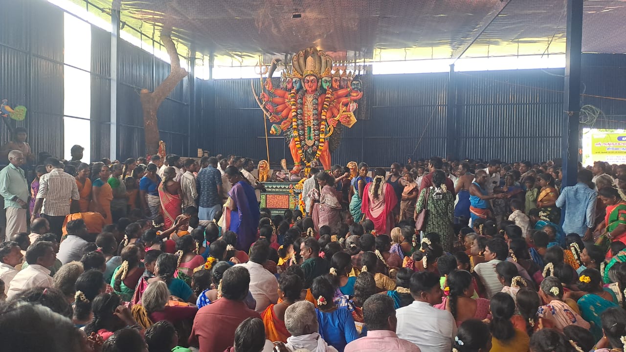 முன்னதாக நான்கு கால யாகசாலை பூஜைகள் நிறைவடைந்து பூர்ணாஹுதி, தீபா ராதனை நடைபெற்றது. தொடர்ந்து புனித நீர் அடங்கிய கடங்கள் மேள, தாளங்கள் முழங்கிட புறப்பட்டு 18 அடி உயரம் கொண்ட அதர்வன பத்ரகாளி தேவிக்கு உற்சவர் பத்ரகாளி தேவி சிலைக்கும் புனித நீர் ஊற்றப்பட்டு கும்பாபிஷேக விழா நடைபெற்றது. இதில் சுற்றுவட்டார கிராமங்களை சேர்ந்த ஏராளமான பக்தர்கள் பங்கேற்று சுவாமி தரிசனம் செய்தனர். பக்தர்களுக்கு அன்னதானம் வழங்கப்பட்டது.
