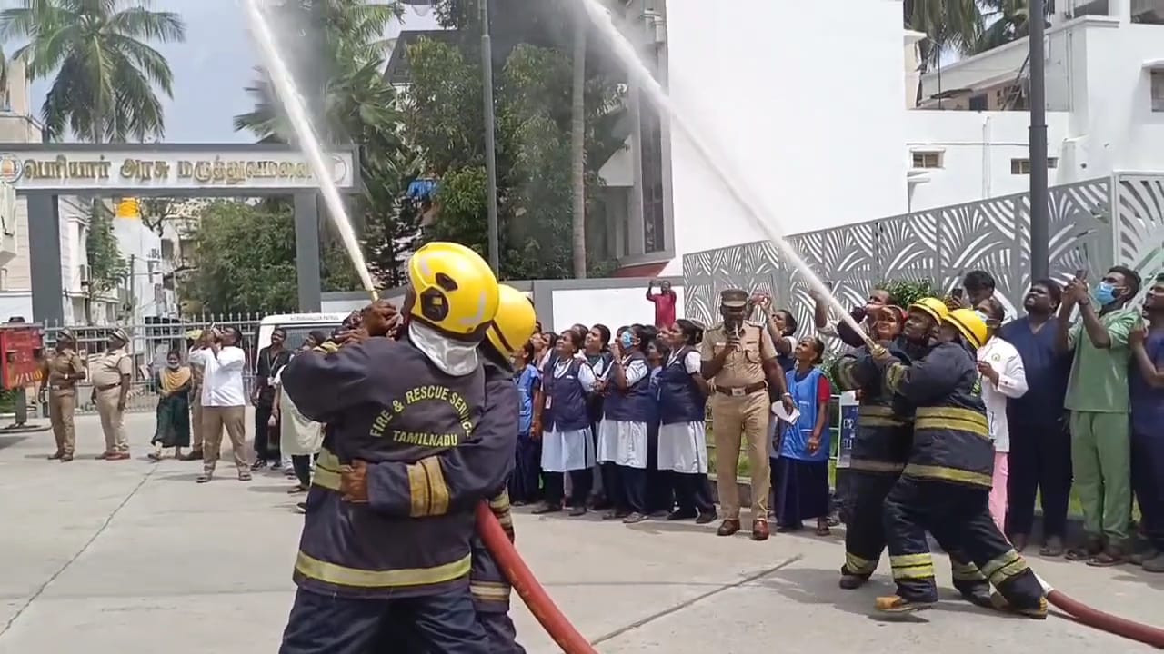 நிலையை அலுவலர் ரமேஷ் முன்னிலையில் சென்னை கொளத்தூரில் உள்ள பெரியார் அரசு மருத்துவமனையில் தீ விபத்து பாதுகாப்பு ஒத்திகை நிகழ்ச்சி நடைபெற்றது.