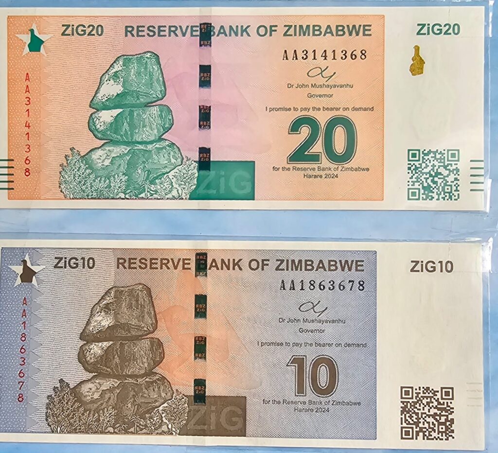 ஏப்ரல் 8, 2024 அன்று பணத்தாள் புழக்கத்திற்கு வந்தது. நீண்டகால பொருளாதார ஸ்திரமின்மையை நிவர்த்தி செய்வதற்காக, ஜிம்பாப்வே ரிசர்வ் வங்கி (RBZ), ஏப்ரல் 5, 2024 அன்று ஜிம்பாப்வே டாலருக்குப் பதிலாக ஜிம்பாப்வே தங்கத்தின் சுருக்கமான ZiG எனப்படும் தங்க ஆதரவு நாணயத்தை அறிமுகப்படுத்தியுள்ளது.பல ஆண்டுகளாக முடக்கப்பட்ட மிகை பணவீக்கம் மற்றும் மாற்று விகித ஏற்ற இறக்கங்களுக்குப் பிறகு, நாட்டின் நிதி அமைப்பில் ஸ்திரத்தன்மையை வழங்குவதையும் நம்பிக்கையை மீட்டெடுப்பதையும் இந்தப் புதுமையான சட்டப்பூர்வ நடவடிக்கை நோக்கமாகக் கொண்டுள்ளது.