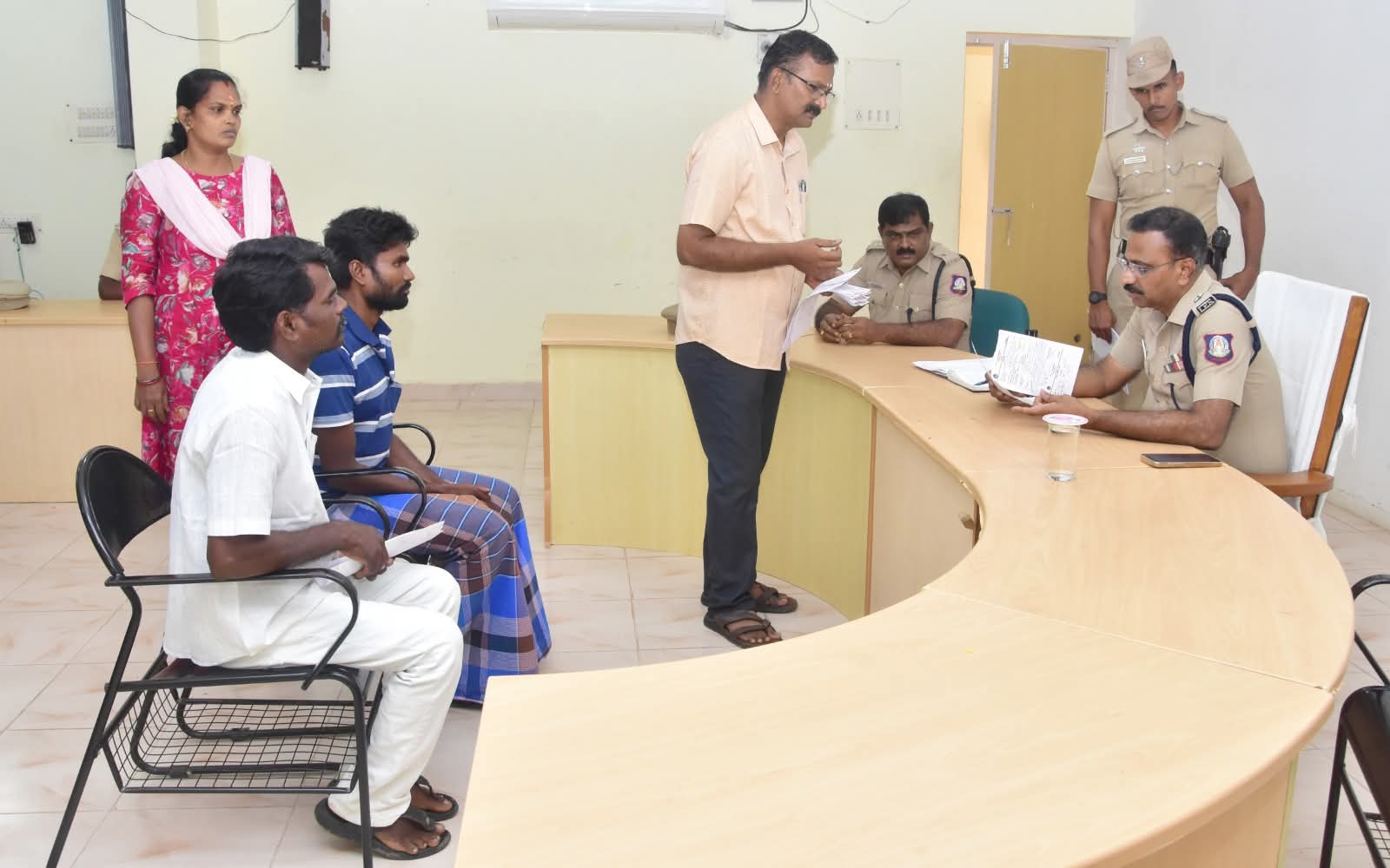 காவல் கண்காணிப்பாளர் எஸ் ஜெயக்குமார் IPS அவர்களிடம் பொதுமக்கள் கொடுத்த புகார் மனுக்கள் சம்பந்தமாக காவல் கண்காணிப்பாளர் அவர்கள் நேரடியாக விசாரணை மேற்கொண்டு, புகார் மனுக்கள் சம்பந்தப்பட்ட காவல் அதிகாரிகள் உடனடியாக விசாரணை மேற்கொண்டு உடனடியாக தீர்வு காண வேண்டும் என்று உத்தரவு பிறப்பித்தார்.