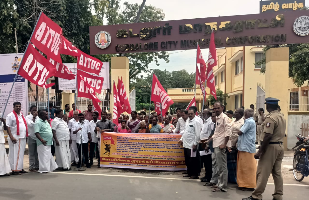 இந்த ஆர்ப்பாட்ட த்திற்கு ஏ.ஐ.டி.யு.சி. தலைவர் பாலு தலைமை தாங்கினார். தங்கராசு, செல்வம்,ரஜினி ஆகியோர் முன்னிலை வகித்தனர். இந்திய கம்யூனிஸ்டு கட்சி மாவட்ட செயலாளர் துரை,மாநில தலைவர் சந்திரகுமார் ஆகியோர் கோரிக்கையை வலியுறுத்தி பேசினார்.