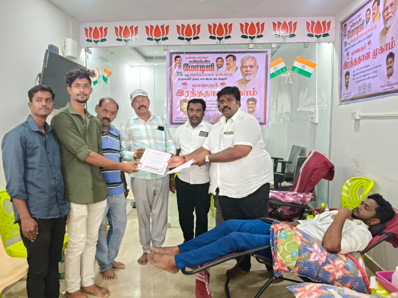 தருமபுரி நகர பாரதிய ஜனதா கட்சியின் சார்பில் பிரதமர் நரேந்திர மோடியின்75 -வது பிறந்தநாள் விழாவை முன்னிட்டு மாபெரும் ரத்த தான முகாம். தருமபுரி நகர பாரதிய ஜனதா கட்சியின் சார்பில் மாபெரும் ரத்ததான முகாம் பாஜக நகர கட்சி அலுவலகத்தில் நகர தலைவர் ஆறுமுகம் தலைமையில் நடைபெற்றது.