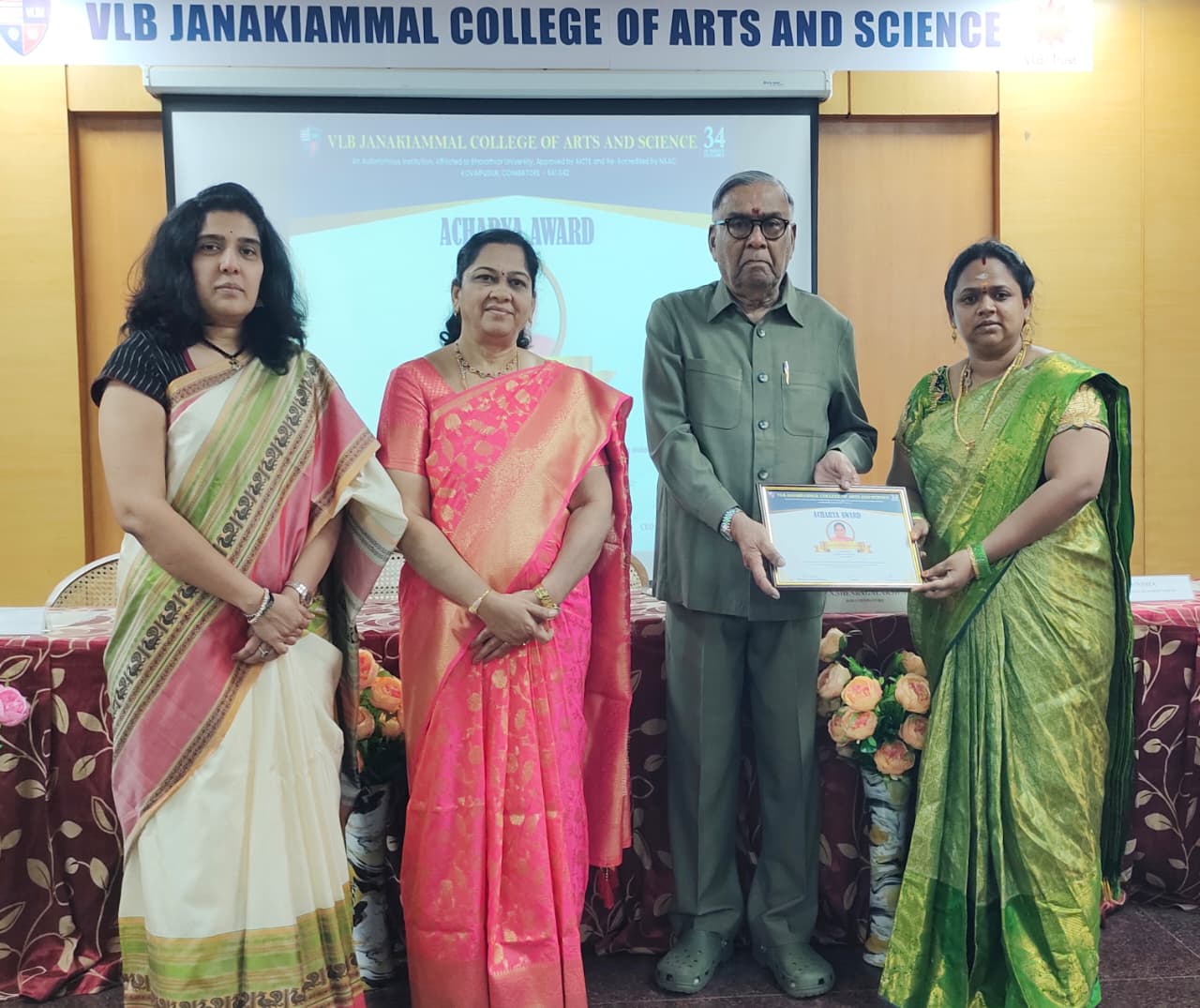 கோவைபுதூர் பகுதியில் செயல்பட்டு வரும் வி.எல்.பி. ஜானகியம்மாள் கலை மற்றும் அறிவியல் கல்லூரி சார்பாக பள்ளி ஆசிரியர்களை கவுரபடுத்தும் விதமாக ஒவ்வொரு ஆண்டும் ஆச்சார்யா விருது வழங்கும் விழா நடைபெற்று வருகின்றது..