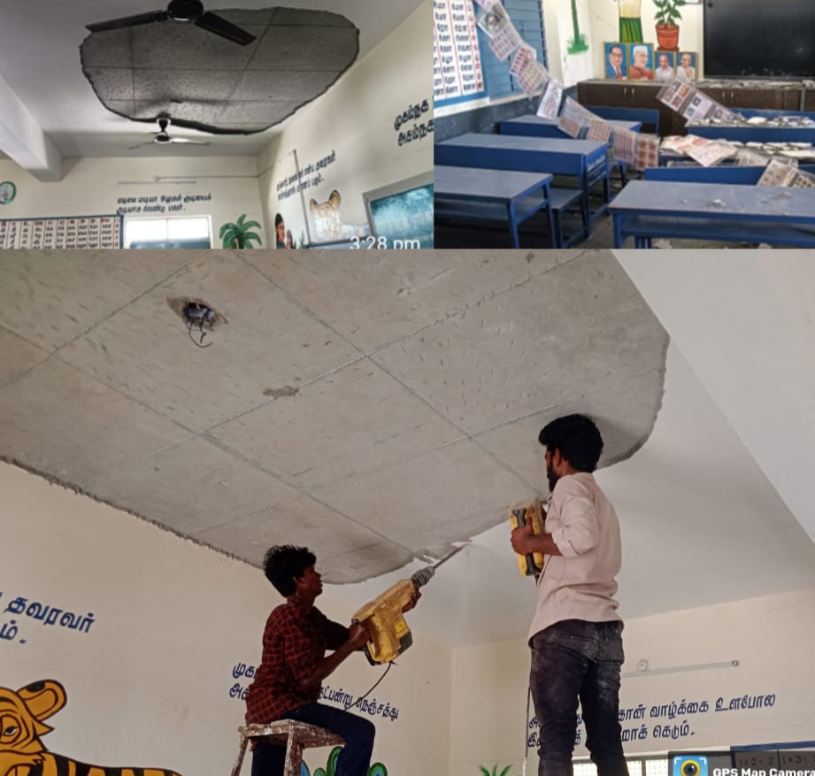 திங்கட்கிழமை காலையில் வழக்கம் போல் பள்ளி வகுப்பறையை திறந்து பார்க்கும் பொழுது மாணவர்கள் அமரும் பெஞ்ச் மீது சிமெண்ட் கான்கிரீட் மேற்கூரை பூச்சு விழுந்து கிடந்துள்ளது.