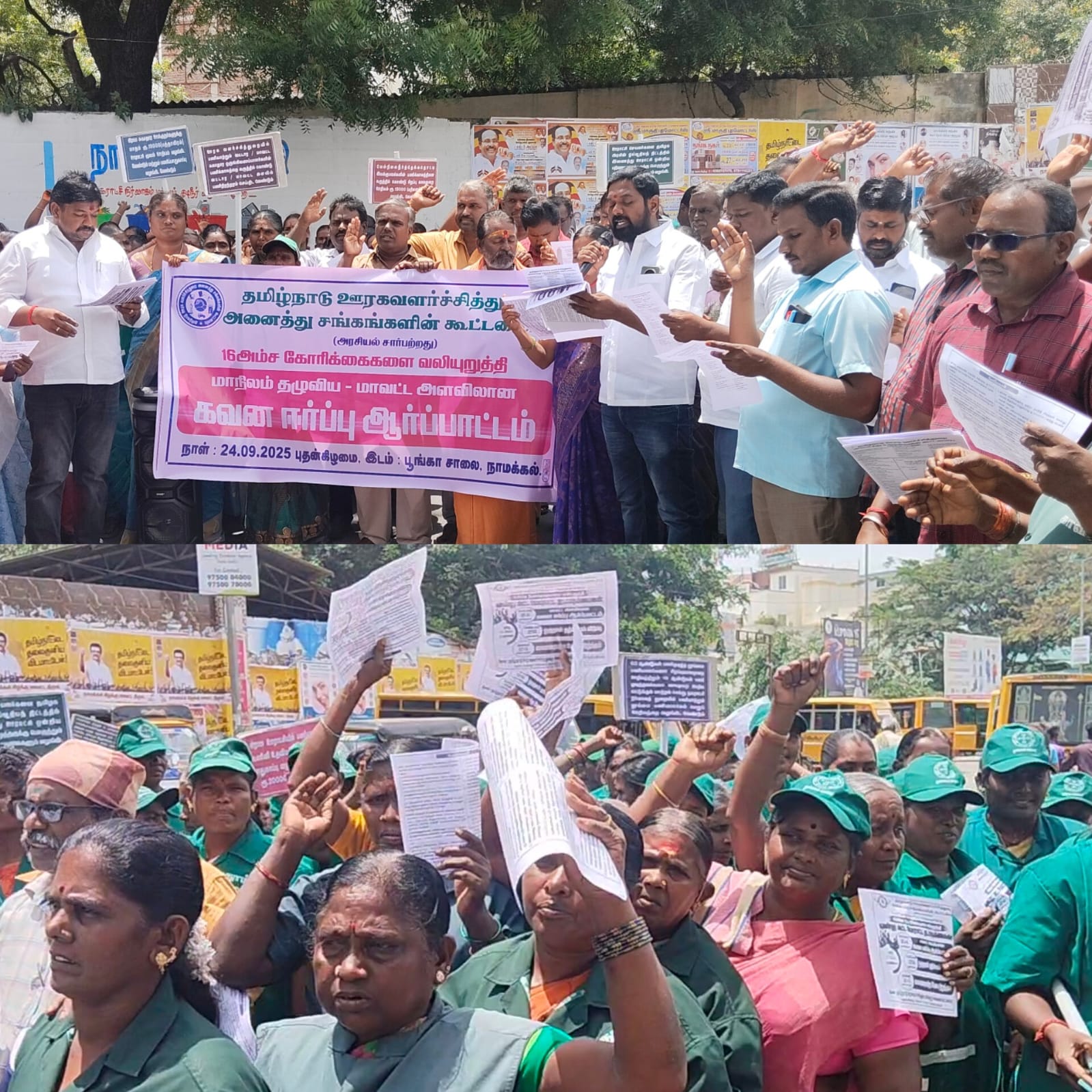 பதினாறு அம்ச கோரிக்கைகளை வலியுறுத்தி தமிழ்நாடு ஊரக வளர்ச்சித் துறை அனைத்து சங்கங்களின் கூட்டமைப்பு சார்பில் கோரிக்கை ஆர்ப்பாட்டம் பெருந்திரளானார் பங்கேற்றனர்