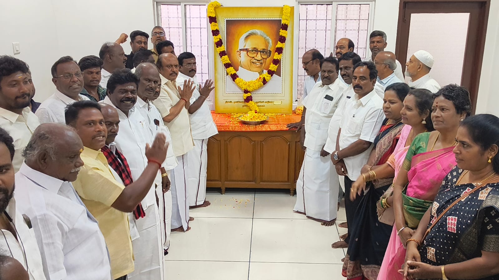 அலங்கரித்து வைக்கப்பட்டிருந்த பேராசிரியர் க. அன்பழகன் அவர்களின் திரு உருவப் படத்திற்கு மாநில கழக அமைப்பாளரும், சட்டமன்ற எதிர்கட்சித் தலைவருமான இரா. சிவா அவர்கள் தலைமையில் திமுகவினர் மலர் தூவி மரியாதை செலுத்தினர். இந்நிகழ்ச்சியில் அவைத்தலைவர் எஸ்.பி. சிவக்குமார், மாநில கழக துணை அமைப்பாளர் வி. அனிபால் கென்னடி எம்.எல்.ஏ, உள்ளிட்ட கழக நிர்வாகிகள் கலந்துகொண்டனர்.