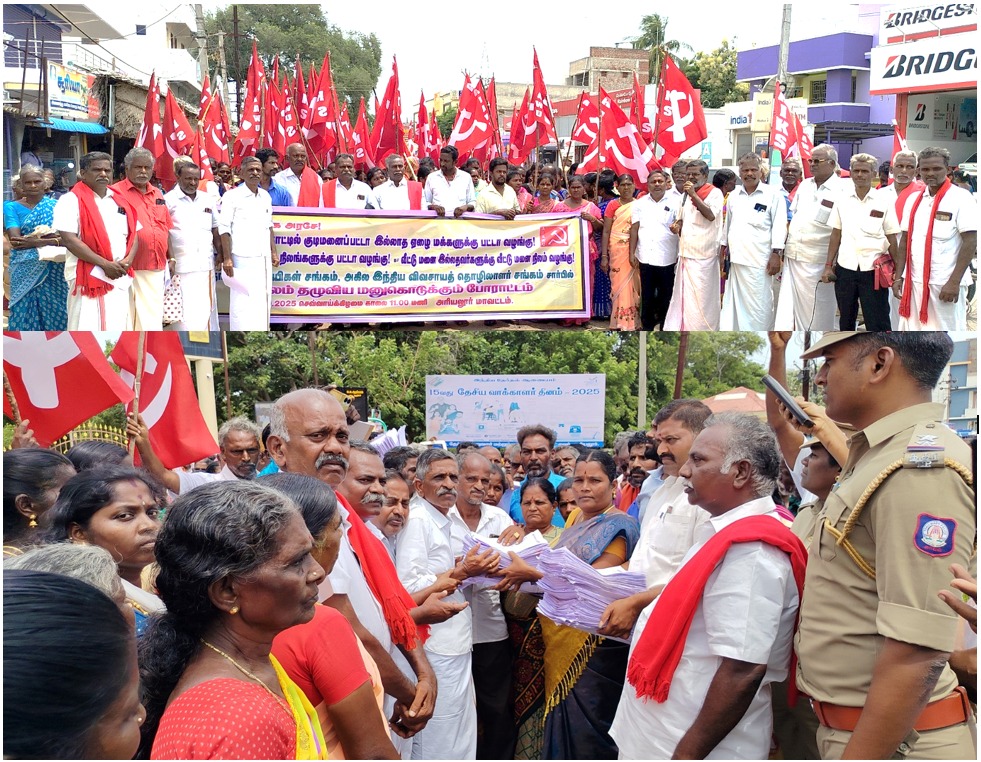 அரியலூரில் நடந்தது மனு கொடுக்கும் போராட்டம் தமிழ்நாடு விவசாயிகள் சங்கம் அகில இந்திய விவசாய தொழிலாளர்கள் சங்கம் இணைந்து தமிழ்நாட்டில் பஞ்சமி நிலங்களை எடுத்து பட்டியல் இன மக்களிடம் வழங்க வேண்டும் நில உச்சவரம்பு சட்டப்படி தனிநபர் கையில் இருக்கும் விளை நிலங்களை எடுத்து நிலம் இல்லாத விவசாயிகளுக்கு வழங்க வேண்டும் அரியலூர் மாவட்டத்தில் நத்தம் புறம்போக்கில் ஆண்டாண்டு காலமாக குடியிருப்பவர்களுக்கு நிபந்தனை இன்றி பட்டா வழங்க வேண்டும் என்பன போன்ற கோரிக்கைகளை வலியுறுத்தி நடந்த போராட்டத்தின் ஊர்வலம் வாலாஜா நகரத்திலிருந்து புறப்பட்டது சிஐடி யு மாவட்ட செயலாளர் தோழர்துரைசாமி துவக்கி வைத்தார்