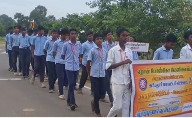 தொன் பாஸ்கோ பள்ளி மற்றும் ஜெயங்கொண்டம் ஒன்றியம் ஆர் சி பாத்திமா உயர்நிலைப்பள்ளி வளாகத்தில் மரக்கன்றுகள் நடப்பட்டு மாணவர்கள் ஒன்றிணைந்து விழிப்புணர்வு பேரணியில் பள்ளி மாணவர்கள் மற்றும் இளைஞர்களிடையே சமூக சேவை சுற்றுச்சூழல் பாதுகாப்பு மேம்படுத்தும் விதமாகவும் மழைநீர் சேகரிப்பு குறித்து விழிப்புணர்வும் இளைஞர்களுக்கிடையே போதை தடுப்பு விழிப்புணர்வு தலைக்கவசம் சாலை விதிகளை பாதுகாப்பது உள்ளிட்ட பல்வேறு பணிகள் குறித்து விழிப்புணர்வு ஏற்படுத்த விழிப்புணர்வு பேரணி நடைபெற்றது
