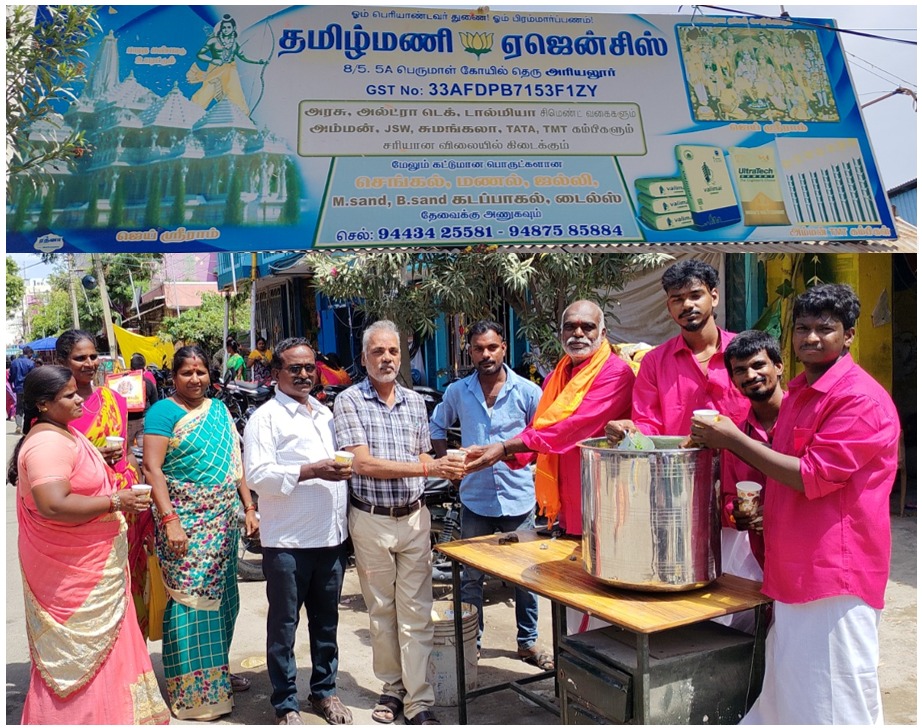 அரியலூரில் நடந்தது அருள்மிகு ஆலந்துறையார் கோதண்ட ராமசாமி திருக்கோயில் திருதேர் திருவிழா சிறப்பாக நடந்தது அதனை தொடர்ந்து பெருமாள் கோயில் தெரு தமிழ்மணி ஏஜென்சிஸ் சார்பில் பொதுமக்கள் பக்தர்களுக்கு நீர் மோர் பாணக்கம் குளிர்பானங்கள் சுண்டல் ஆகியவற்றை எம். பாபு குழுவினர் பொதுமக்களுக்கு வழங்கினார்கள் இதை ஏராளமான பக்தர்கள் பிரசாதங்கள் பெற்று சென்றனர்