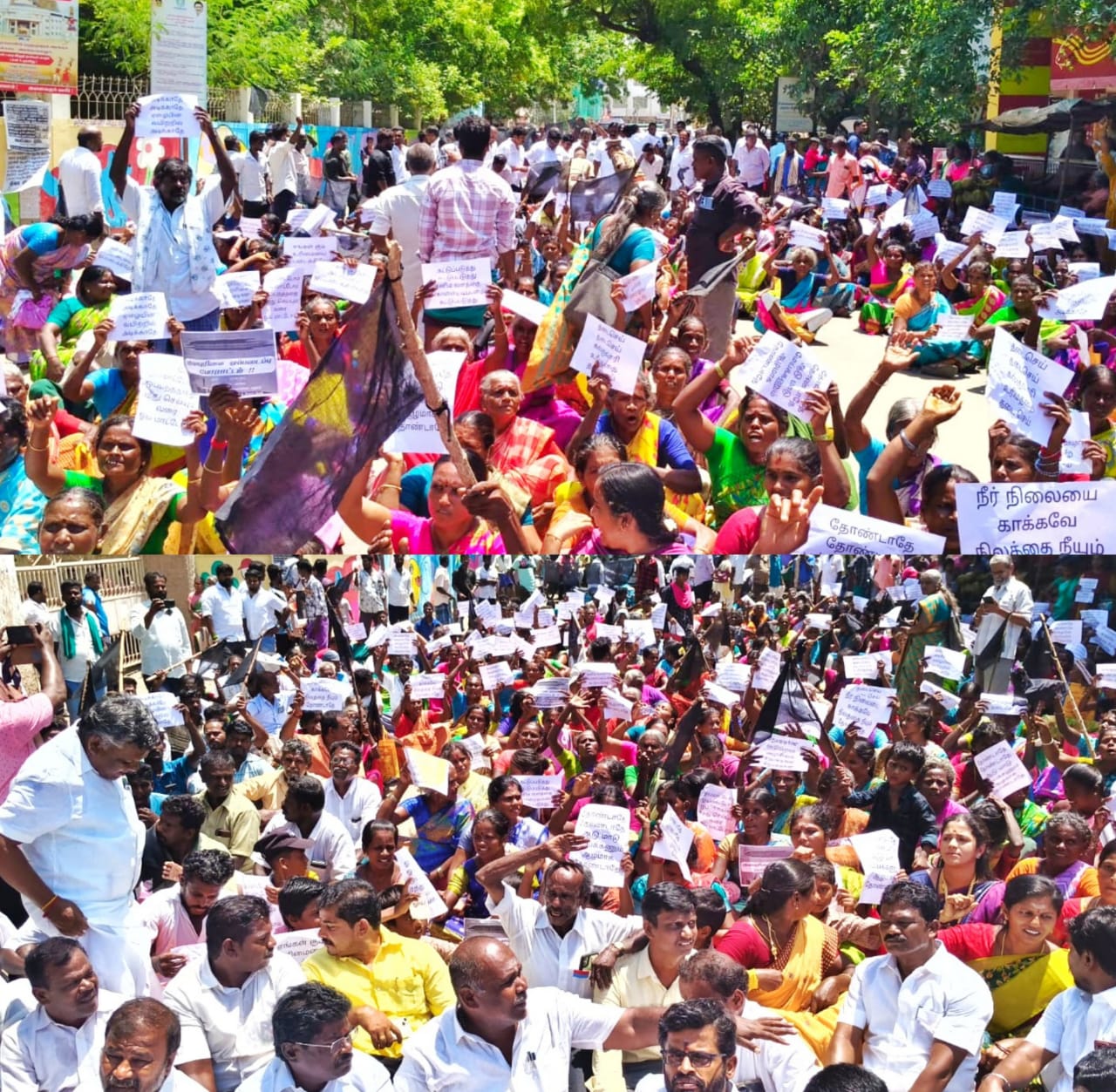 இதனைத் தொடர்ந்து மாவட்ட ஆட்சியர் அலுவலகம் முன்பு வந்த பொதுமக்களை காவல் துறையினர் அனுமதிக்க மறுத்தனர். இதனை தொடர்ந்து மாவட்ட ஆட்சியர் அலுவலகம் முன்பு சாலையில் கொளுத்தும் வெயில் என்று பாராமல் கல்குவாரியை தடை செய்ய வேண்டும் என்று கோஷம் போட்டு தர்ணா போராட்டத்தில் ஈடுபட்டனர் மேலும் வெயில் தாக்கம் அதிகமானதால் நான்கு பெண்கள் மயக்கமடைந்தனர்