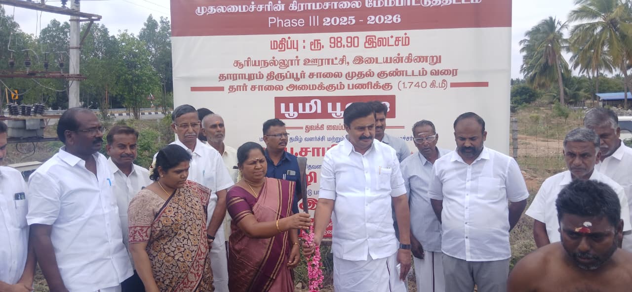 தாராபுரம் அடுத்த இடையின்கிணறு ஊராட்சியில் கிராம சாலைகள் மேம்பாட்டு திட்டத்தின் கீழ் புதிய திட்டப்பணிகளை அமைச்சர்கள் மு.பெ. சாமிநாதன், கயல்விழி செல்வராஜ் ஆகியோர் துவக்கி வைத்தனர்.