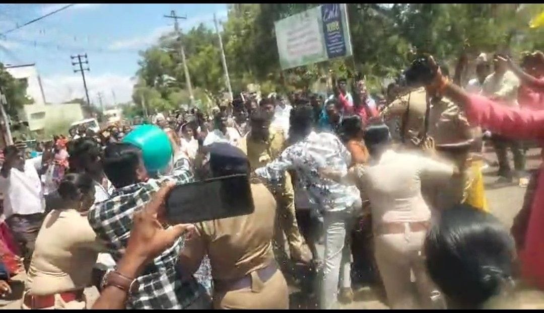 உடனடியாக அங்கு பாதுகாப்பு பணியில் ஈடுபட்டிருந்த டிஎஸ்பி தமிழ் இனியன், இன்ஸ்பெக்டர் ராபர்ட் ஜெயின் மற்றும் ஆண் போலீசார் பெண் போலீசார் அனைவரும் கூட்டத்திற்குள் புகுந்து மண்ணெண்ணெய் ஊற்றிய நபர்களை அடையாளம் கண்டு உடனடியாக அவர்களின் தலையில் தண்ணீரை ஊற்றினார்கள்.