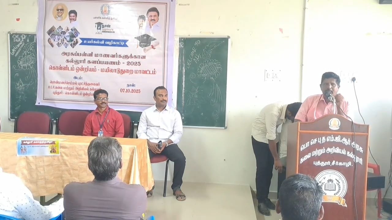 மயிலாடுதுறை மாவட்டம் சீர்காழி அடுத்த புத்தூர் பொன்மனச் செம்மல் புரட்சித் தலைவர் எம்ஜிஆர் கலை மற்றும் அறிவியல் கல்லூரியில் தமிழக பள்ளிக் கல்வித் துறை சார்பாக அரசு பள்ளி மாணவர்களுக்கான கல்லுரி களப்பயணம் உயர்கல்வி வழிகாட்டி