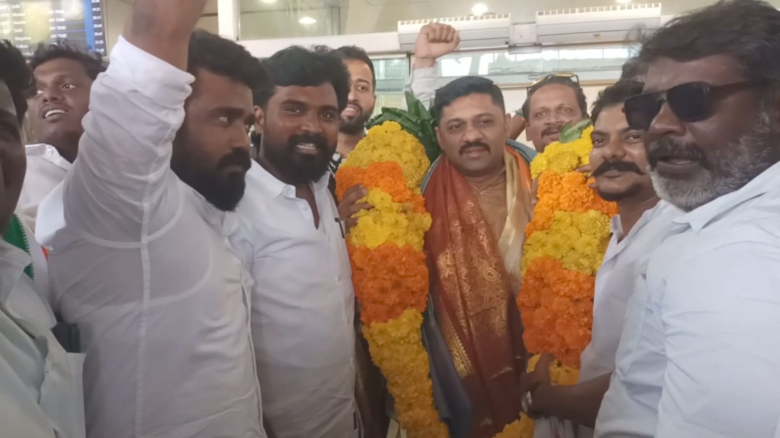 சென்னை விமான நிலையம் வந்தடைந்த அவருக்கு இளைஞர் காங்கிரஸ் கட்சியை சேர்ந்த ஏராளமானோர் மாலை அணிவித்து பூங்கொத்து கொடுத்தும் சால்வை அணிவித்தும் உற்சாகமாக வரவேற்றனர்