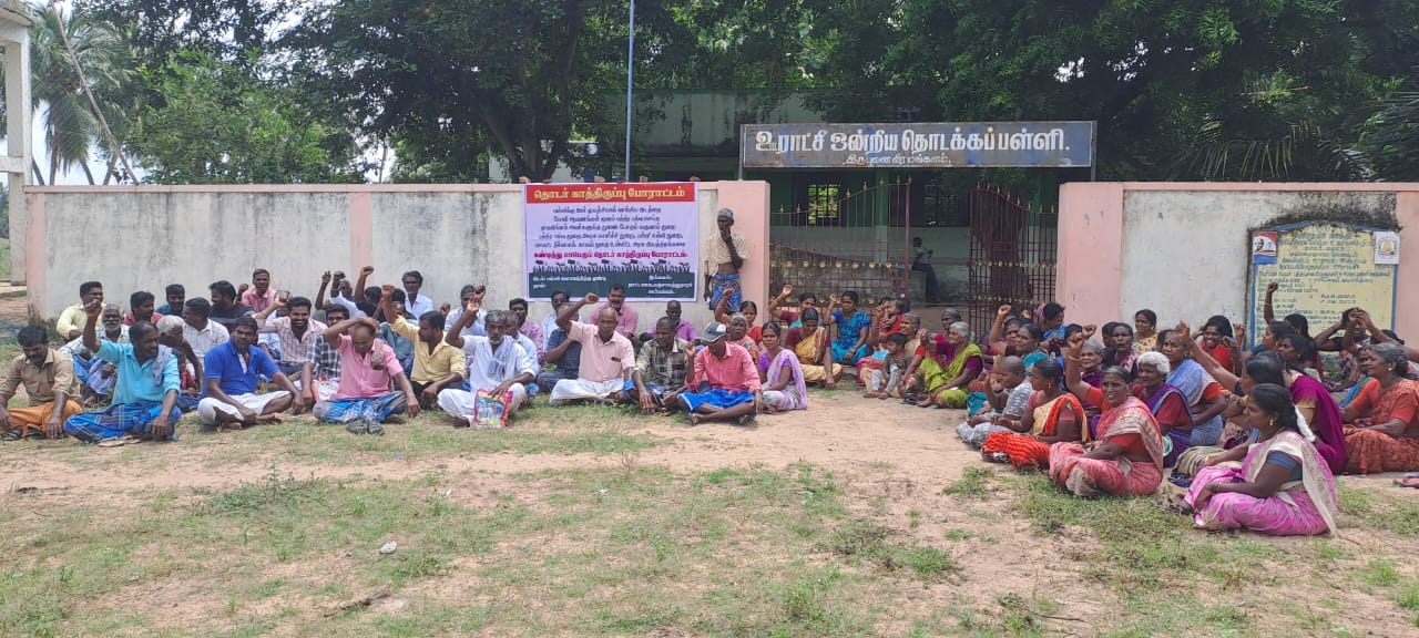 இது குறித்து திருபுவனவீரமங்கலம் கிராம மக்கள் சார்பில் சம்பந்தப்பட்ட அதிகாரிகளுக்கு பல முறை கோரிக்கை மனு கொடுத்தும் இதுவரை அதிகாரிகள் நடவடிக்கை எடுக்கவில்லை. இதனால் ஆத்திரம் அடைந்த கிராம மக்கள் 100க்கும் மேற்பட்ட ஆண்,பெண்கள் திருபுவனஊராட்சி ஒன்றிய துவக்க பள்ளிக்கு முன்புறம் அமர்ந்து பள்ளிக்கு சொந்தமான இடத்தை மீண்டும் பள்ளிக்கு மீட்டு தர வலியுறுத்தி கோஷம் எழுப்பி காத்திருப்பு போராட்டத்தில் ஈடுபட்டனர்.