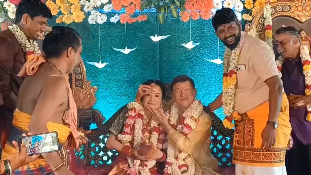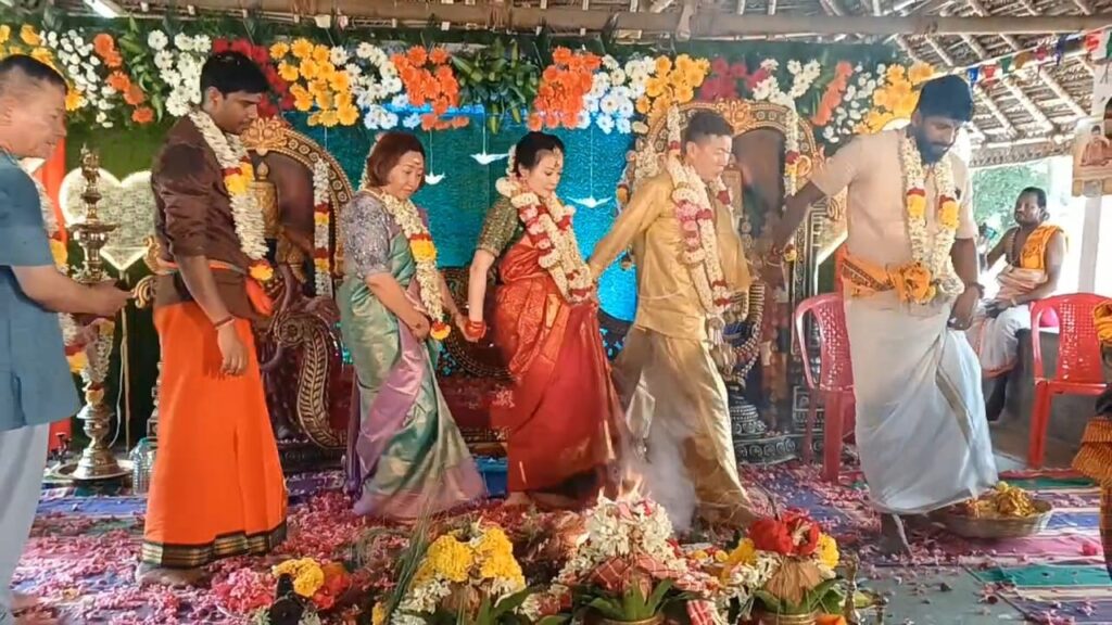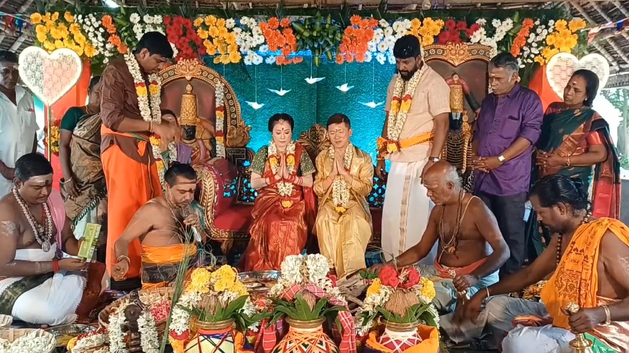 இந்நிலையில் சித்தர் பீடத்தில் தைவான் நாட்டை சேர்ந்த டாகாங்,டிங்வன் இருவரும் இந்து முறைப்படி திருமணம் செய்து கொண்டனர். முன்னதாக இருவரும் காதலித்து வந்த நிலையில் இந்தியாவில் இந்து முறைபடி திருமணம் செய்து கொள்ள இருவரும் விரும்பியுள்ளனர். இதனையடுத்து தமிழ்நாடு வந்த இருவரும் தமிழ் முறைப்படி சீர்காழி அருகேயுள்ள ஒளிலாயம் சித்தர் பீடத்தில் இன்று அம்மி மிதித்து, அருந்ததி பார்த்து திருமணம் செய்து கொண்டனர். திருமணத்தில் கலந்து கொள்வதற்காக தைவான் நட்டிலிருந்து வந்திருந்த உறவினர்களும்