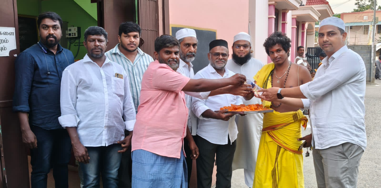 இந்நிலையில் கோவில் உள்ள பகுதிக்கு அருகிலேயே சுமார் 300 வருடங்களுக்கு மேல் பழமையான பள்ளிவாசல் வழியாக திருவிழாவில் கலந்து கொள்ளும் பக்தர்கள் ஊர்வலமாக செல்லும் போது,மாலை பள்ளிவாசல் தொழுகை முடிந்து ஒன்று கூடிய இஸ்லாமியர்கள் அந்த வழியாக வந்த பக்தர்களுக்கு தண்ணீர் பாட்டில்களையும்,இனிப்புகளையும் வழங்கி தங்கள் வாழ்த்துக்களை தெரிவித்தனர்..